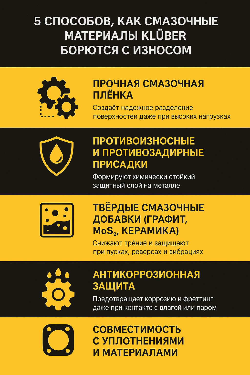 Некоторые продукты Klüber содержат графит, дисульфид молибдена или керамические частицы, образующие устойчивый антифрикционный слой.