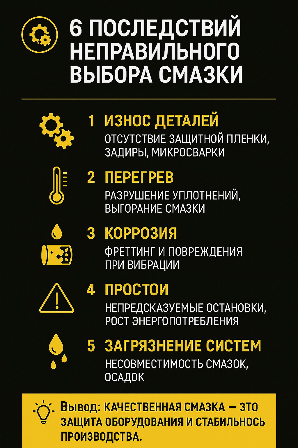 Применение неподходящих или низкокачественных смазочных материалов ведёт к повреждениям узлов, потере ресурса оборудования и росту эксплуатационных затрат.
