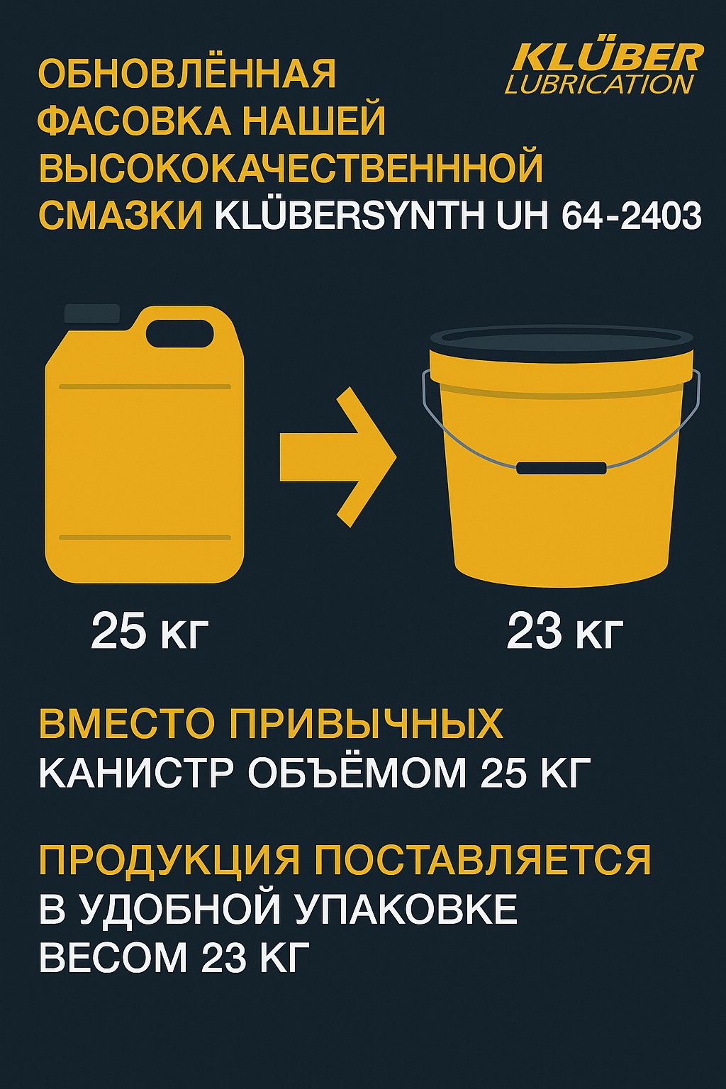 Мы рады сообщить вам важную новость: наша высококачественная смазка Klubersynth UH1 64-2403 получила обновлённую фасовку. Теперь вместо привычных канистр объёмом 25 кг продукция поставляется в удобной упаковке весом 23 кг.